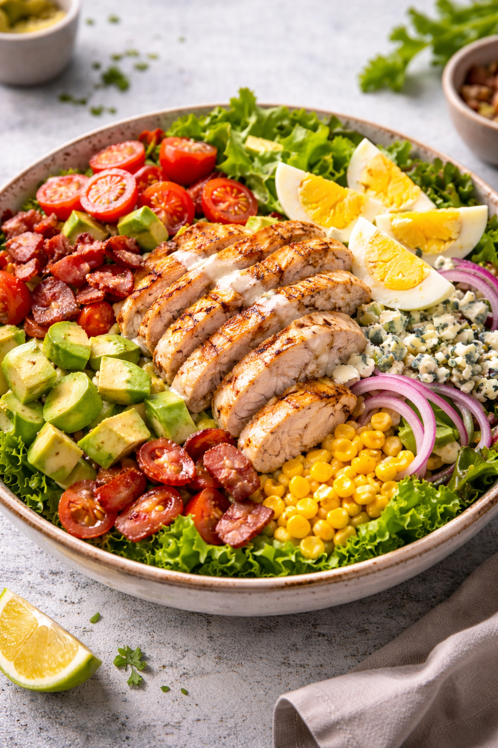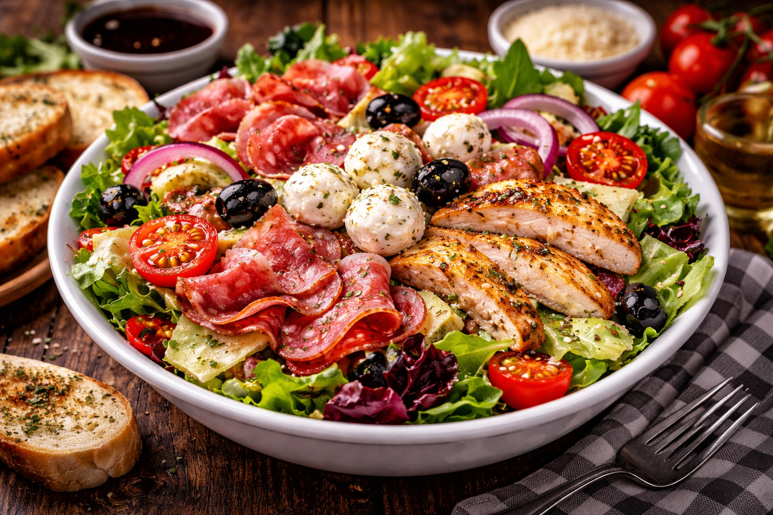 Salade, tomates, oignons, poulet grillé, poivrons