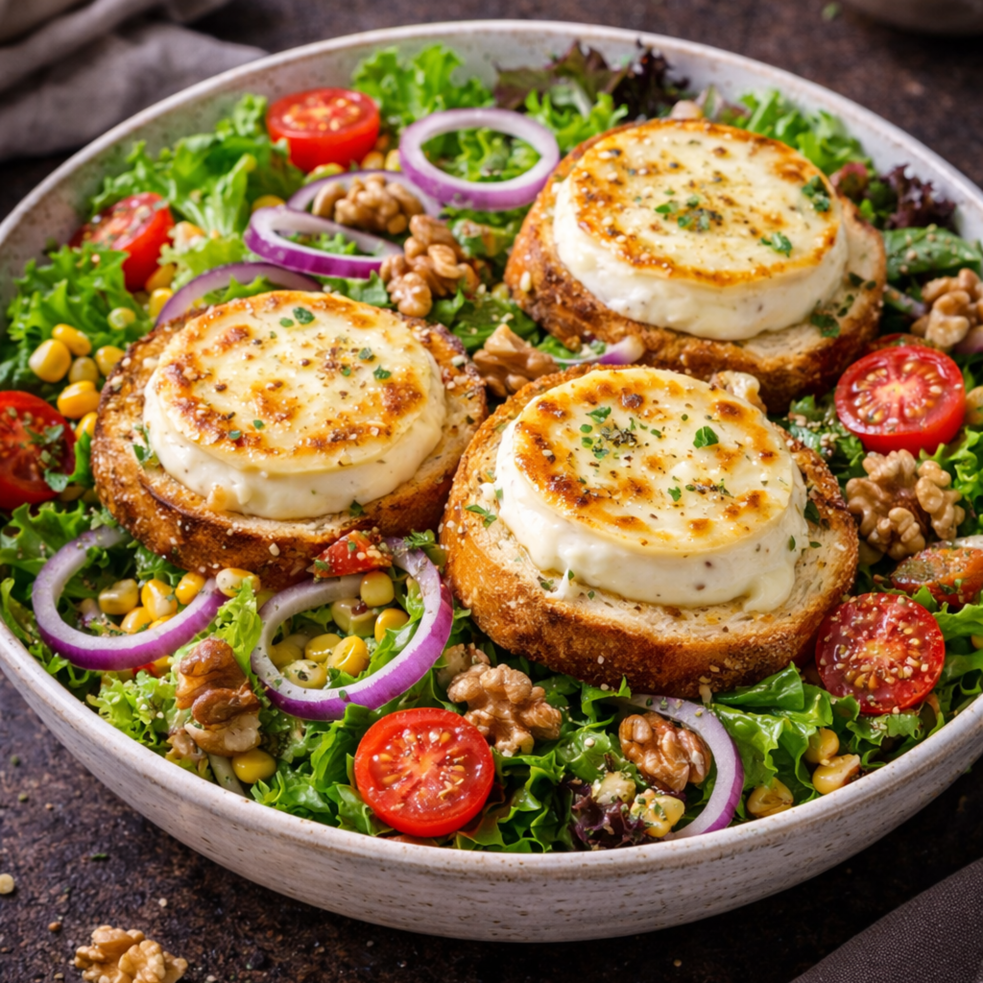 Salade, tomates, oignons, chèvre chaud sur toast