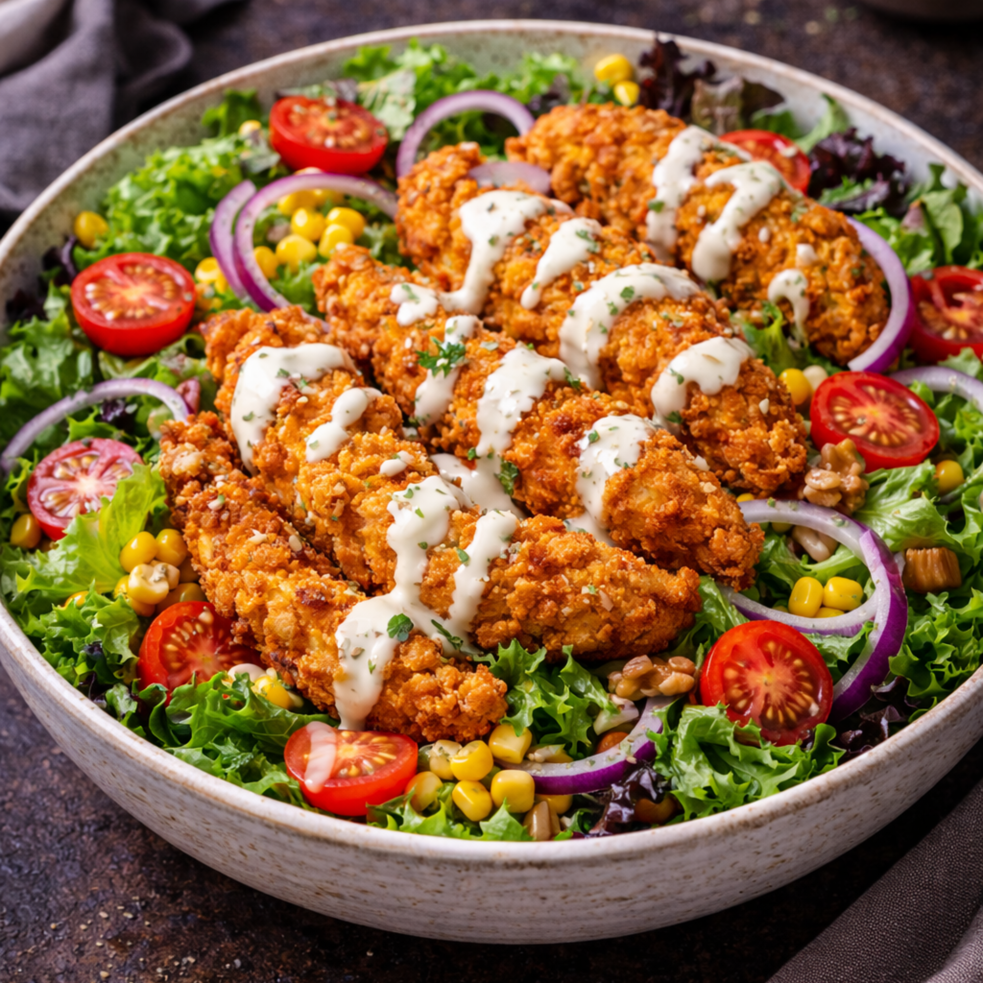 Salade, tomates, oignons, tenders, poivrons
